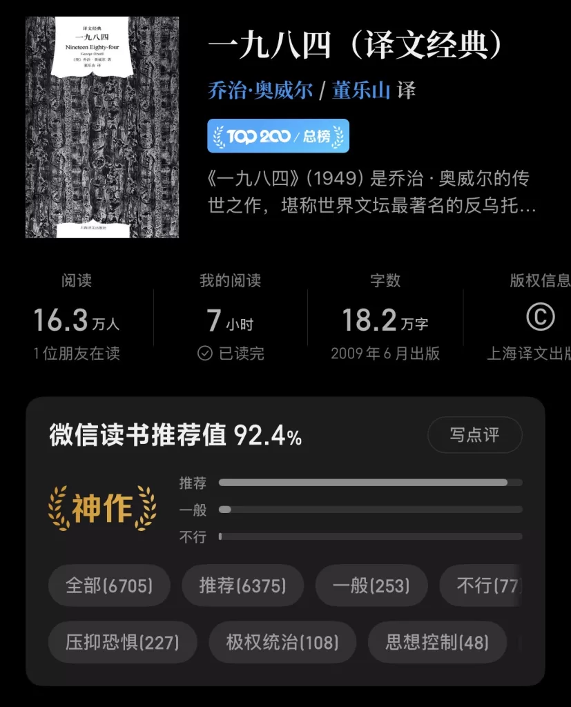 阅遍了无数致敬与衍生的作品,却始终未曾翻开原著,这便是我阅读此书的契机。原著的笔触更为犀利,它剖析了‘老大哥’如何利用威权碾碎个体意志,以换取所谓的社会稳固。阅读过程令人窒息,更引发了对当下言论环境的深层反思——坦白说,书中那张无形的网,与我们身处的现实竟有着惊人的相似。