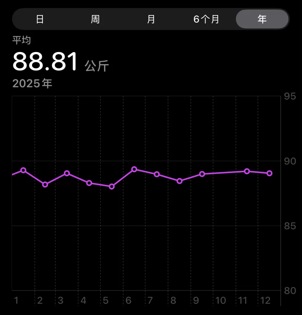 体格方面,今年算是无功无过,体重稳定维持在89公斤这一水平。明年的目标很明确:重点攻克‘顽固’的肚腩。不求体重数字的剧烈变化,只求体脂率的实质下降,让身型更匀称挺拔,毕竟还得为以后去滑雪练个好身板嘛。