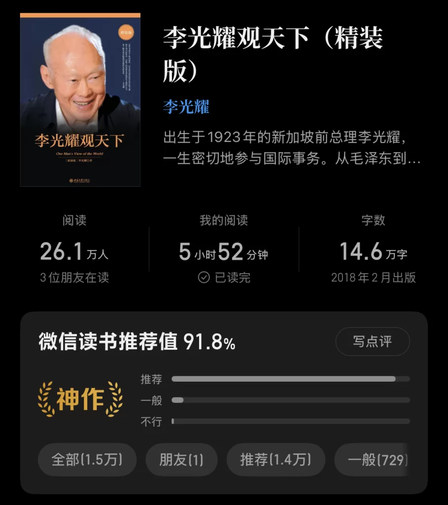此外,该书独特的观察切面亦是一大亮点。作为兼具西方政治体制外壳与中华文化内核的国家,新加坡拥有得天独厚的观察位。这种特殊的‘混血’视角,让李光耀在看待中国问题时,既不同于西方的隔岸观火,也有别于内部的当局者迷。阅读此书,能让我们借助邻国的目光,更理性地审视自身,并尝试厘清邻国与我们之间那种复杂而微妙的对立关系。