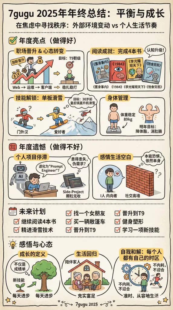 若将时间拨回年初,我未曾预料到这会是充满矛盾与自洽交织的一年。在AI技术狂飙突进、职场赛道不断切换的外部世界里,我感到过前所未有的焦虑与迷茫;但在阅读、滑雪与陪伴家人的生活缝隙中,我又找回了内心的秩序。站在2025年的终点回望,我不再执着于追赶别人的步频,而是试着在自己的时区里,校准前行的钟摆。